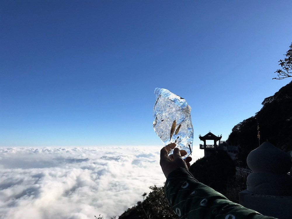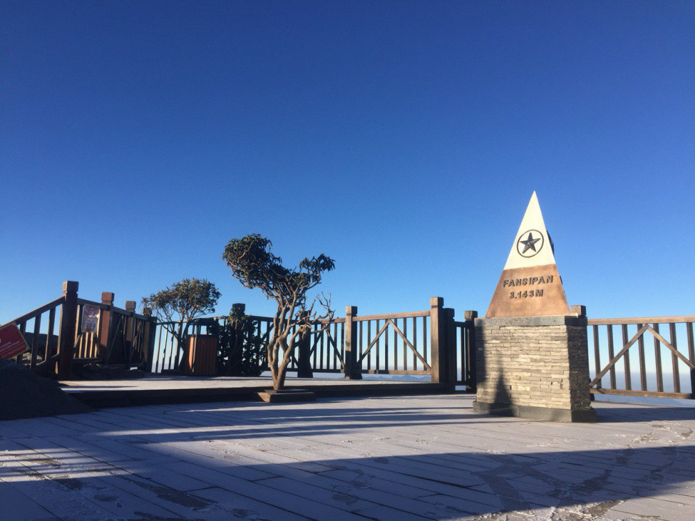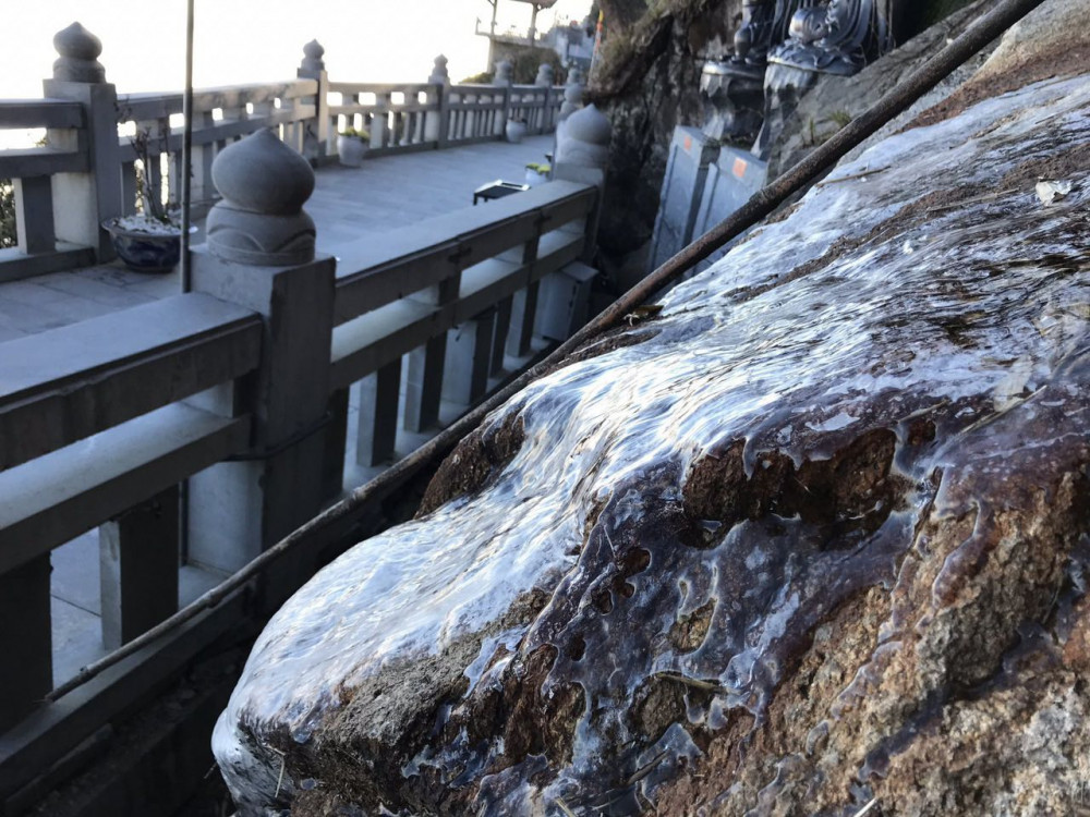 Đến 7h30 sáng nay, nhiệt độ tại khu vực đỉnh đã tăng lên 6 độ C, trời trong xanh nhưng lặng gió nên lớp băng tiếp tục phủ trắng mặt sàn gỗ nơi đặt chóp tháp 3.143m và bám những lớp trong vắt lấp lánh trên các phiến đá dọc đường La Hán, tạo nên một khung cảnh thiên nhiên vô cùng kỳ thú.