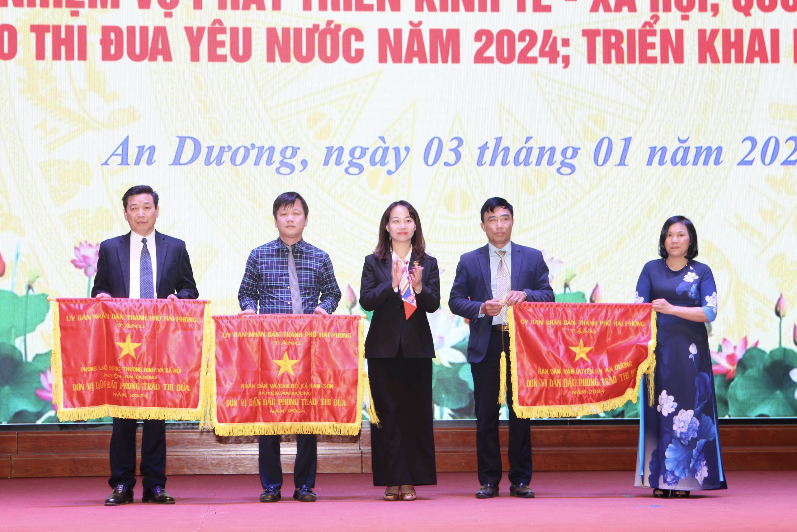 Năm 2024, quận An Dương hoàn thành và hoàn thành vượt mức 14/14 chỉ tiêu phát triển kinh tế xã hội, thu ngân sách đạt 4.929,829 tỷ đồng, bằng 102% so với kế hoạch (đứng thứ nhất khối quận, huyện về số thu tuyệt đối). Hoàn thành Đồ án quy hoạch phân khu đô thị tỷ lệ 1/2000; quận bố trí vốn đầu tư công triển khai thực hiện 132 dự án, bao gồm: 34 dự án giao thông, 45 dự án giáo dục, 09 dự án xây dựng trụ sở cơ quan hành chính, 19 dự án môi trường, 01 dự án thuộc lĩnh vực quốc phòng, 23 dự án thuộc lĩnh vực văn hóa. Trong đó, có 40 dự án khởi công mới; có 83 dự án cơ bản hoàn thành và đưa vào sử dụng trong năm 2024. Thực hiện giải phóng mặt bằng 3.194 tổ chức và công dân, bàn giao mặt bằng trên 560.000m² đất các loại để triển khai các dự án, công trình, đảm bảo tiến độ. Đến hết năm 2024, có 15/15 xã đạt chuẩn nông thôn mới kiểu mẫu, hoàn thành trước 01 năm so với chỉ tiêu Nghị quyết Đại hội Đảng bộ. Duy trì 100% trường học đạt chuẩn quốc gia, chất lượng giáo dục được nâng lên: Tỷ lệ học sinh đỗ vào Lớp 10 THPT công lập đạt 80,46%, tăng 2,69% so với năm học trước, đứng thứ 6/14 quận huyện; tỷ lệ học sinh tốt nghiệp THPT trên địa bàn huyện đạt 100%. Công tác chăm sóc sức khỏe Nhân dân tiếp tục có bước chuyển biến tích cực, mạng lưới tổ chức y tế được kiện toàn. Chính sách an sinh xã hội đảm bảo kịp thời, hiệu quả với yêu cầu năm sau cao hơn năm trước; đặc biệt đã tập trung huy động các nguồn lực thăm hỏi kịp thời, hỗ trợ xây sửa cho 87 hộ nghèo, hộ cận nghèo, hộ có hoàn cảnh khó khăn thiệt hại về nhà ở do Bão số 3.