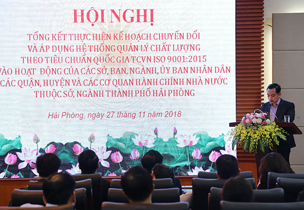 Sáng 27/11, tại Trung tâm Hội nghị thành phố, UBND thành phố tổ chức Hội nghị tổng kết thực hiện Kế hoạch chuyển đổi và áp dụng Hệ thống quản lý chất lượng theo tiêu chuẩn TCVN ISO 9001:2015 vào hoạt động của các sở, ban, ngành, UBND các quận, huyện và các cơ quan hành chính nhà nước thuộc sở, ngành thành phố. Dự và chỉ đạo Hội nghị có đồng chí Lê Khắc Nam, Phó Chủ tịch UBND thành phố. Tham dự có đại diện lãnh đạo sở, ban, ngành, quận huyện; cán bộ phụ trách ISO tại các đơn vị.