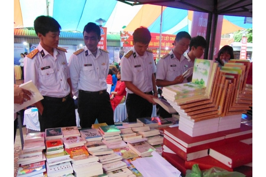 Cán bộ, chiến sĩ Quân chủng Hải quân tìm đọc sách tại tọa đàm.