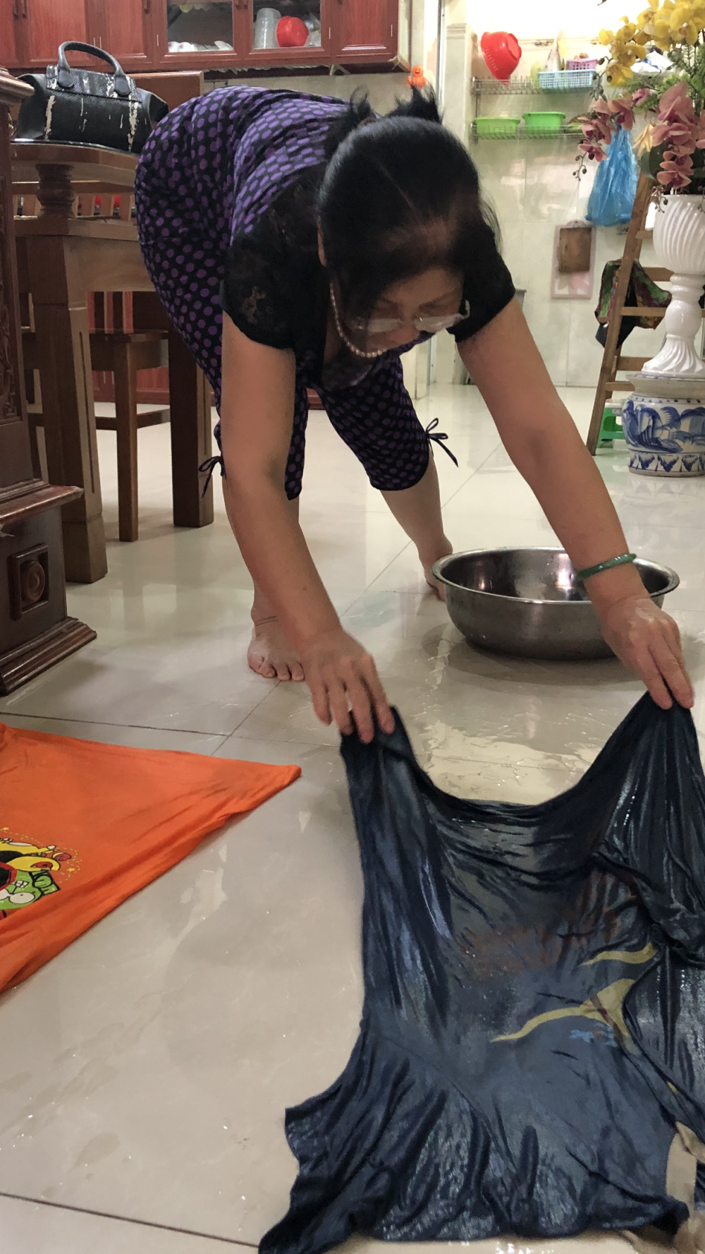 Gia đình thường xuyên đắp khăn mát để hạ nhiệt phần nền nhà bị nóng