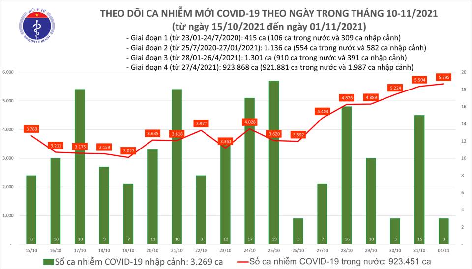 Bản tin dịch COVID-19 ngày 1/11 của Bộ Y tế cho biết có 5.598 ca mắc COVID-19 tại TP HCM, An Giang, Kiên Giang và 46 tỉnh, thành khác; trong ngày có 1.731 bệnh nhân khỏi; 52 ca tử vong.