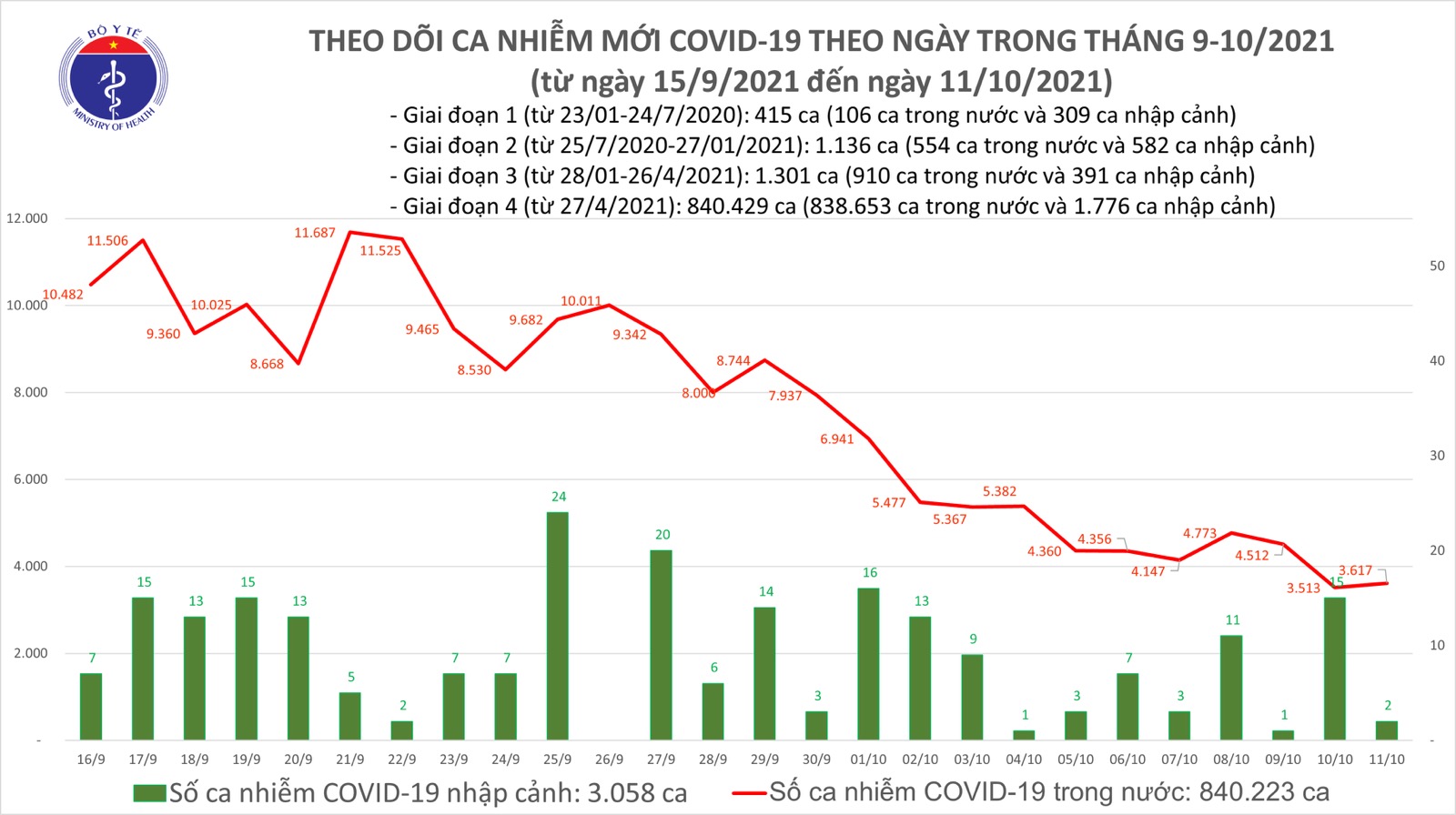 Tính từ 17h ngày 10/10 đến 17h ngày 11/10, trên Hệ thống Quốc gia quản lý ca bệnh COVID-19 ghi nhận 3.619 ca nhiễm mới, trong đó 02 ca nhập cảnh và 3.617 ca ghi nhận trong nước (tăng 104 ca so với ngày trước đó) tại 44 tỉnh, thành phố (có 1.726 ca trong cộng đồng).