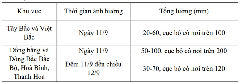 Khu vực đồng bằng và Đông Bắc Bắc Bộ, Hoà Bình, Thanh Hóa: Ngày 11/9, có mưa to đến rất to và dông với lượng mưa phổ biến 50-100 mm, cục bộ có nơi trên 200 mm.