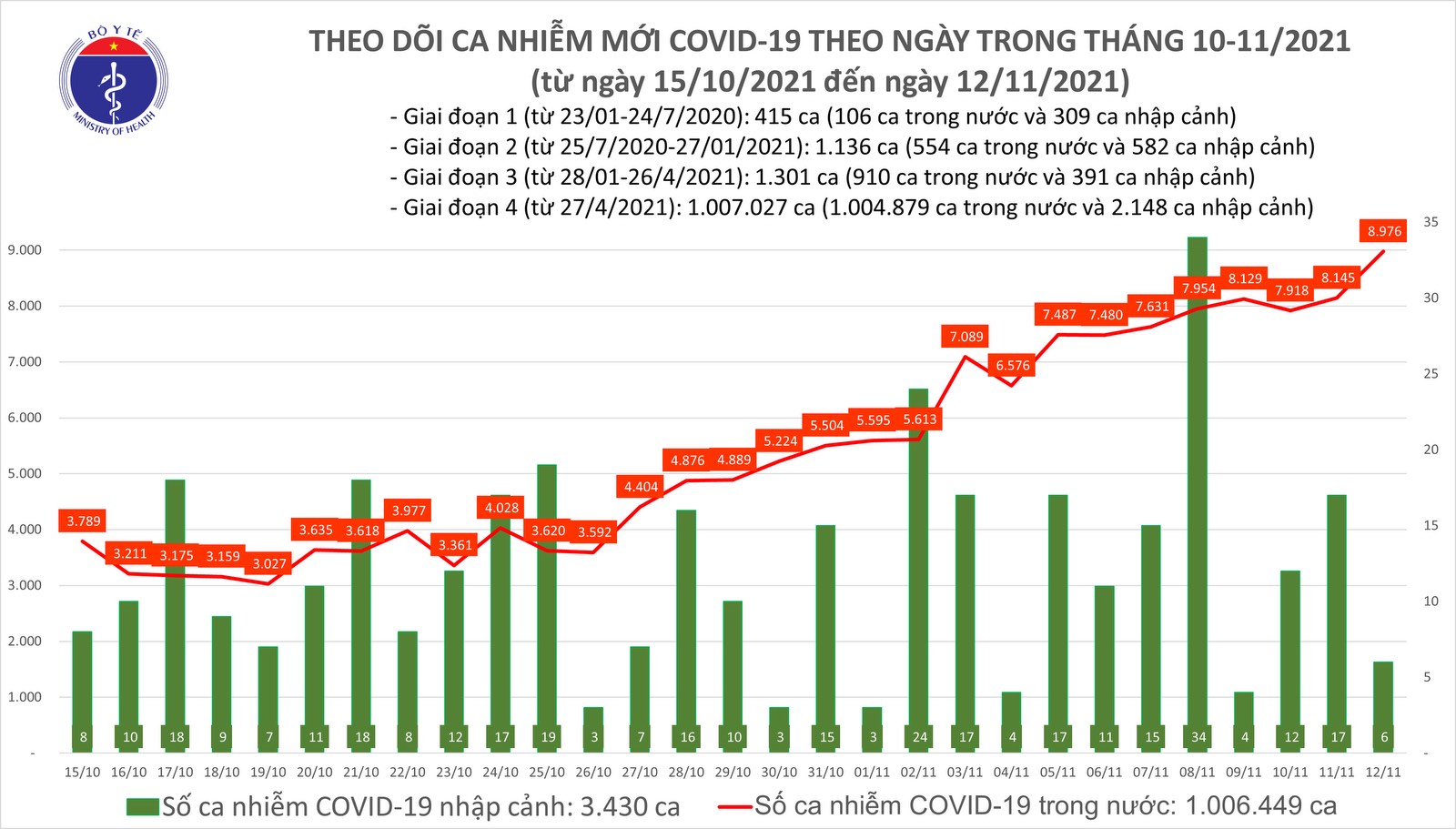 Tính từ 16h ngày 11/11 đến 16h ngày 12/11, trên Hệ thống Quốc gia quản lý ca bệnh COVID-19 ghi nhận 8.982 ca nhiễm mới, trong đó 6 ca nhập cảnh và 8.976 ca ghi nhận trong nước (tăng 831 ca so với ngày trước đó) tại 56 tỉnh, thành phố (có 4.180 ca trong cộng đồng).