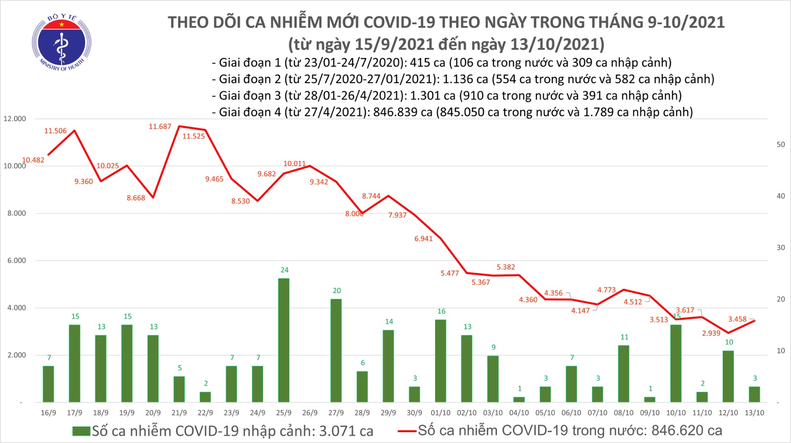 Bản tin dịch COVID-19 ngày 13/10 của Bộ Y tế cho biết có 3.461 ca mắc COVID-19 tại TP HCM, Hà Nội và 45 địa phương khác. Trong ngày có 1.191 bệnh nhân khỏi.