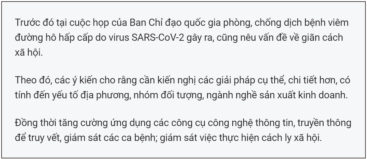 Thủ tướng nhắc lại những nguyên tắc như khóa chặt từ bên ngoài, khoanh vùng dập dịch nhanh ở bên trong. Người đứng đầu phải chịu trách nhiệm ở địa phương của mình, trong ngành của mình, tại cơ sở sản xuất kinh doanh nếu được phép mở theo quyết định của chủ tịch UBND địa phương.