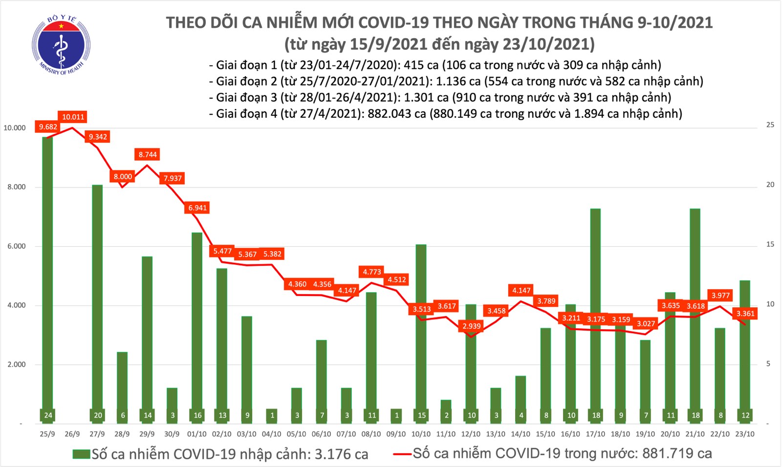 – Tính từ 17h ngày 22/10 đến 17h ngày 23/10, trên Hệ thống Quốc gia quản lý ca bệnh COVID-19 ghi nhận 3.373 ca nhiễm mới, trong đó 12 ca nhập cảnh và 3.361 ca ghi nhận trong nước (giảm 616 ca so với ngày trước đó) tại 47 tỉnh, thành phố (có 1.332 ca trong cộng đồng).