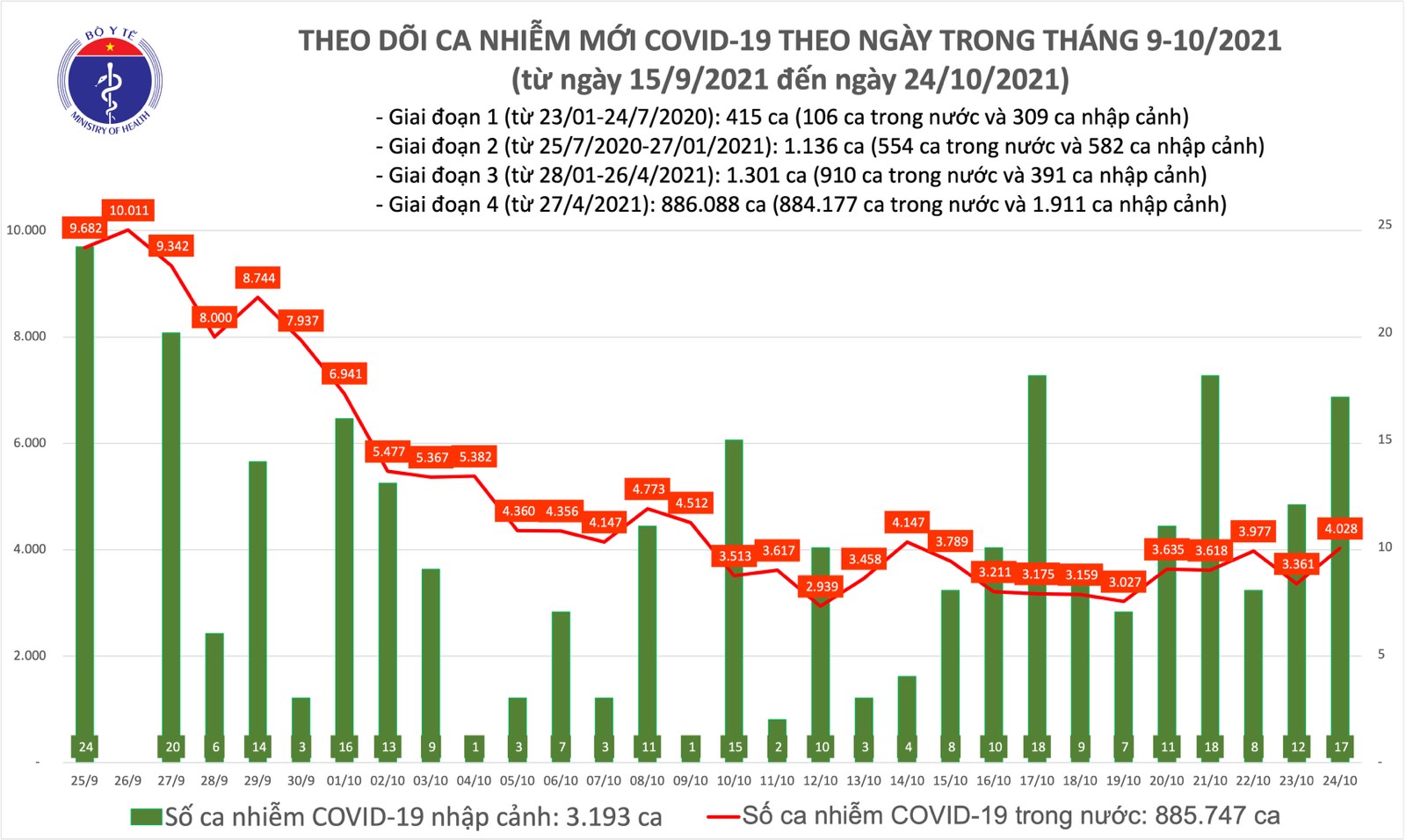 – Tính từ 17h ngày 23/10 đến 17h ngày 24/10, trên Hệ thống Quốc gia quản lý ca bệnh COVID-19 ghi nhận 4.045 ca nhiễm mới, trong đó 17 ca nhập cảnh và 4.028 ca ghi nhận trong nước (tăng 667 ca so với ngày trước đó) tại 47 tỉnh, thành phố (có 1.599 ca trong cộng đồng).