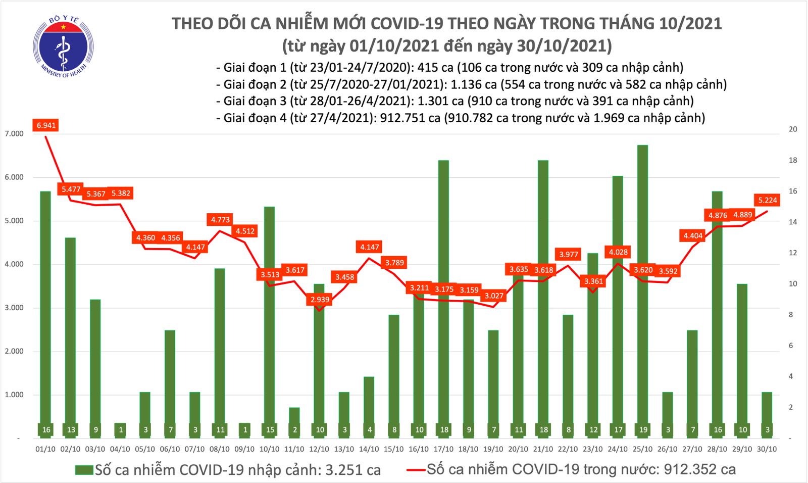 Bản tin dịch COVID-19 ngày 30/10 của Bộ Y tế cho biết có 5.227 ca mắc COVID-19 tại TP HCM, Hà Nội và 48 tỉnh, thành khác; trong ngày có 2.204 bệnh nhân khỏi; 64 ca tử vong.