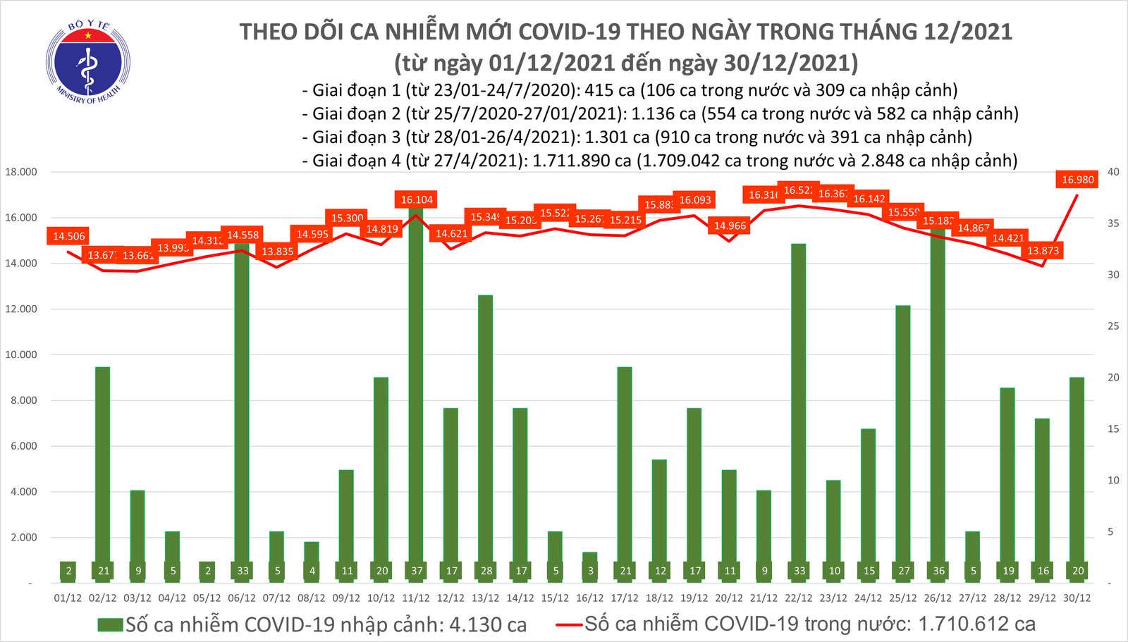 – Tính từ 16h ngày 29/12 đến 16h ngày 30/12, trên Hệ thống Quốc gia quản lý ca bệnh COVID-19 ghi nhận 17.000 ca nhiễm mới, trong đó 20 ca nhập cảnh và 16.980 ca ghi nhận trong nước (tăng 3.107 ca so với ngày trước đó) tại 61 tỉnh, thành phố (có 11.404 ca trong cộng đồng).