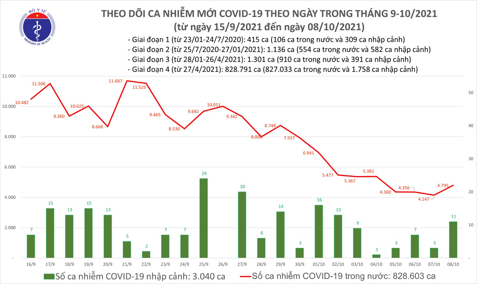 Bản tin dịch COVID-19 của Bộ Y tế ngày 8/10 cho biết có thêm 4.806 ca mắc COVID-19 tại 42 tỉnh, thành phố, riêng TP HCM là 4.806 ca; trong ngày có 994 bệnh nhân COVID-19 khỏi bệnh.