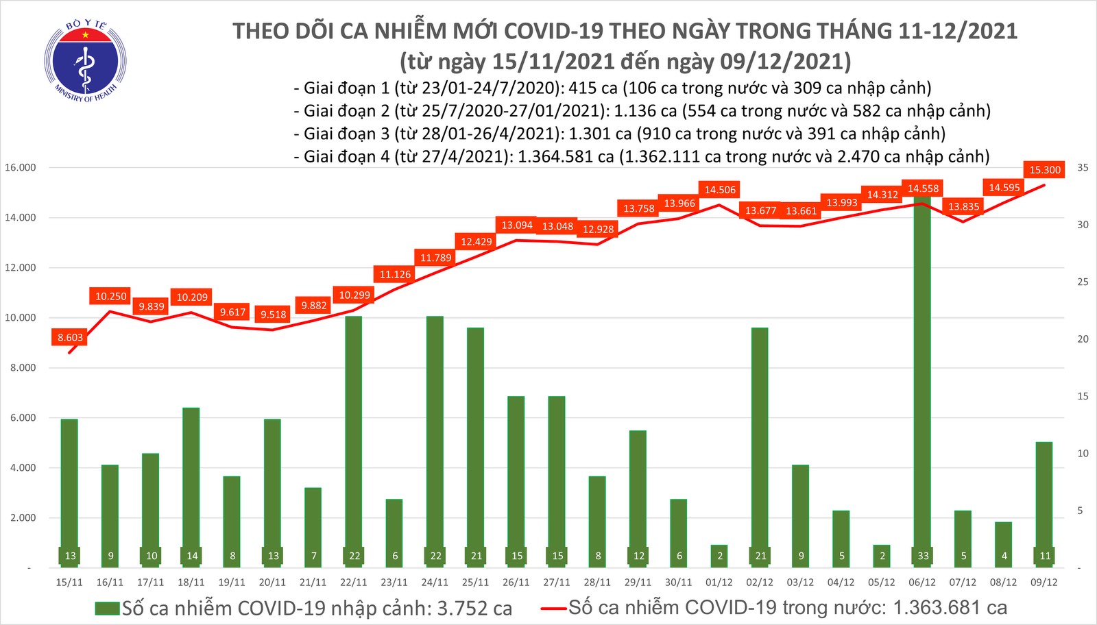 – Tính từ 16h ngày 08/12 đến 16h ngày 09/12, trên Hệ thống Quốc gia quản lý ca bệnh COVID-19 ghi nhận 15.311 ca nhiễm mới, trong đó 11 ca nhập cảnh và 15.300 ca ghi nhận trong nước (tăng 705 ca so với ngày trước đó) tại 61 tỉnh, thành phố (có 8.843 ca trong cộng đồng).