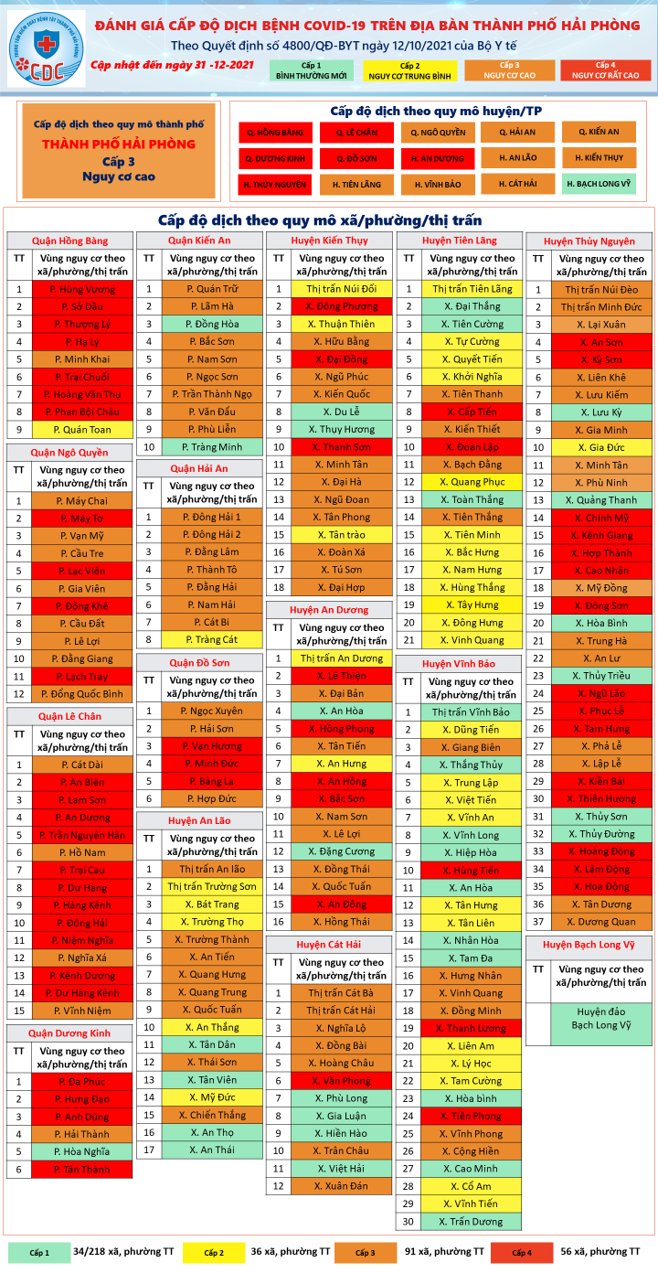 Trong ngày 31.12, Trung tâm Kiểm soát bệnh tật thành phố Hải Phòng thông tin về cấp độ dịch bệnh COVID-19 trên địa bàn thành phố, trong đó, có 6 quận, huyện thuộc vùng “nguy cơ cao”.