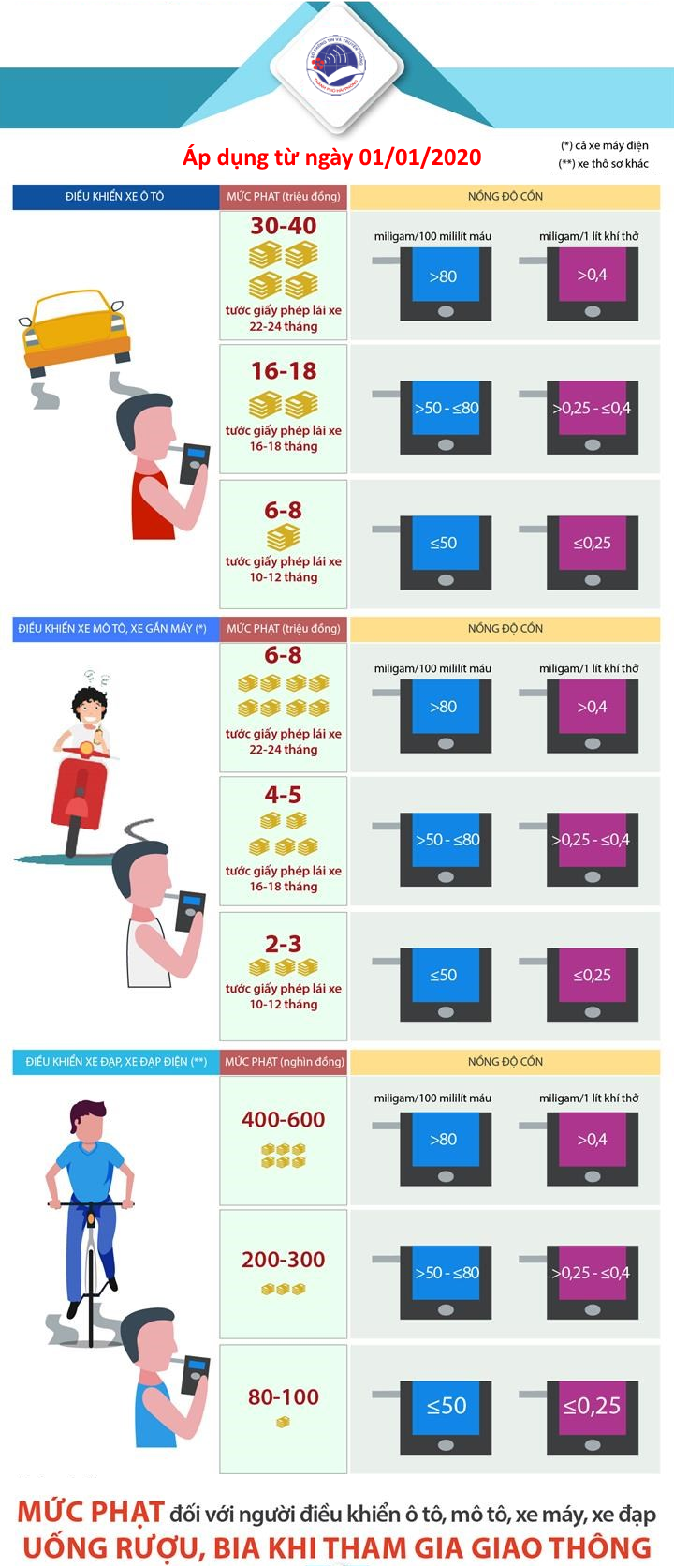 Từ ngày 01/01/2020, Nghị định 100/2019/NĐ-CP quy định xử phạt vi phạm hành chính trong lĩnh vực giao thông đường bộ và đường sắt chính thức có hiệu lực, quy định mức xử phạt nặng hơn so với Nghị định 46/2016/NĐ-CP đối với các vi phạm nồng độ cồn.