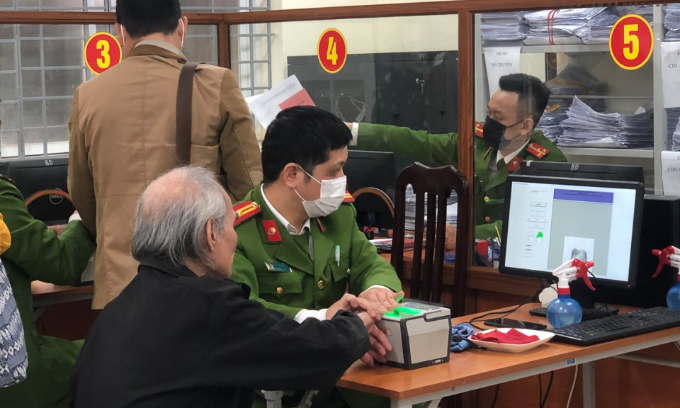 Lực lượng Công an thu nhận thông tin cấp thẻ Căn cước công dân gắn chíp cho người dân để phục vụ việc cấp tài khoản định danh điện tử.