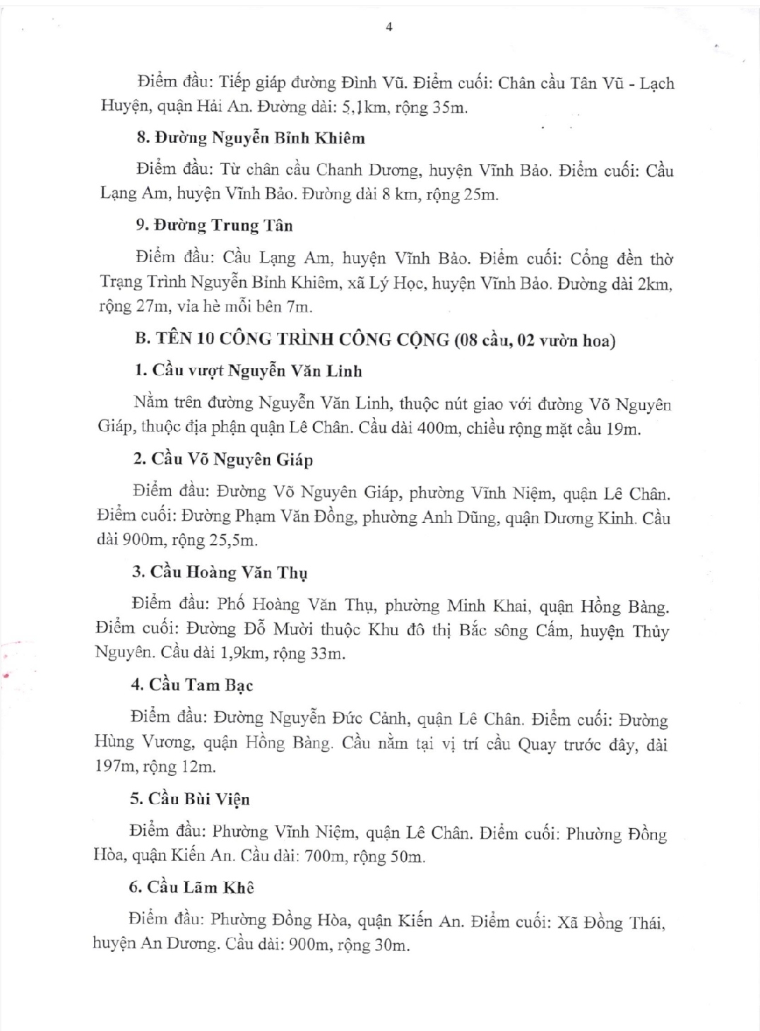 Theo đó, Thành phố Hải Phòng đặt tên 9 đường, 8 cầu và 02 vườn hoa. Các sở, ban ngành liên quan và UBND các quận, huyện tổ chức thực hiện Nghị quyết theo đúng quy định; tổ chức gắn biển tên đường và công trình công cộng; tuyên truyền sâu rộng trong Nhân dân về ý nghĩa tên các đường và công trình công cộng. Nghị quyết này được Hội đồng nhân dân thành phố khóa XV, kỳ họp thứ 14 thông qua ngày 22/7/2020 và có hiệu lực kể từ ngày 01/8/2020.