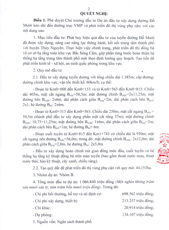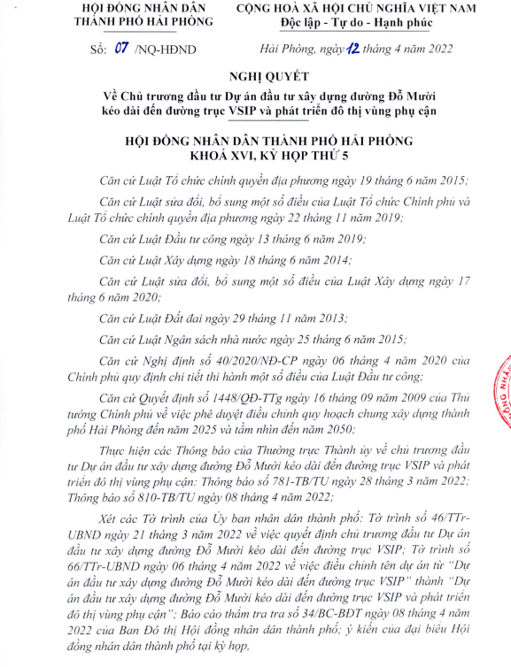 Nghị quyết số 07/NQ-HĐND ngày 12/04/2022 về Chủ trương đầu tư Dự án đầu tư đường Đỗ Mười kéo dài đến đường trục VSIP và phát triển đô thị vùng phụ cận