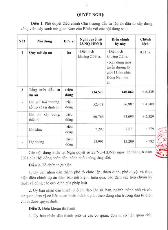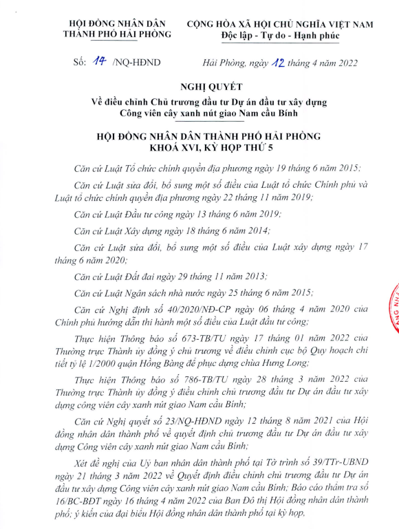 Nghị quyết số: 14/NQ-HĐND ngày 12/4/2022 Về điều chỉnh Chủ trương đầu tư Dự án đầu tư xây dựng Công viên cây xanh nút giao Nam cầu Bính