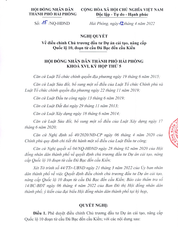 Nghị quyết số: 15/NQ-HĐND ngày 12/4/2022 Về điều chỉnh Chủ trương đầu tư Dự án cải tạo, nâng cấp Quốc lộ 10, đoạn từ cầu Đá Bạc đến cầu Kiền