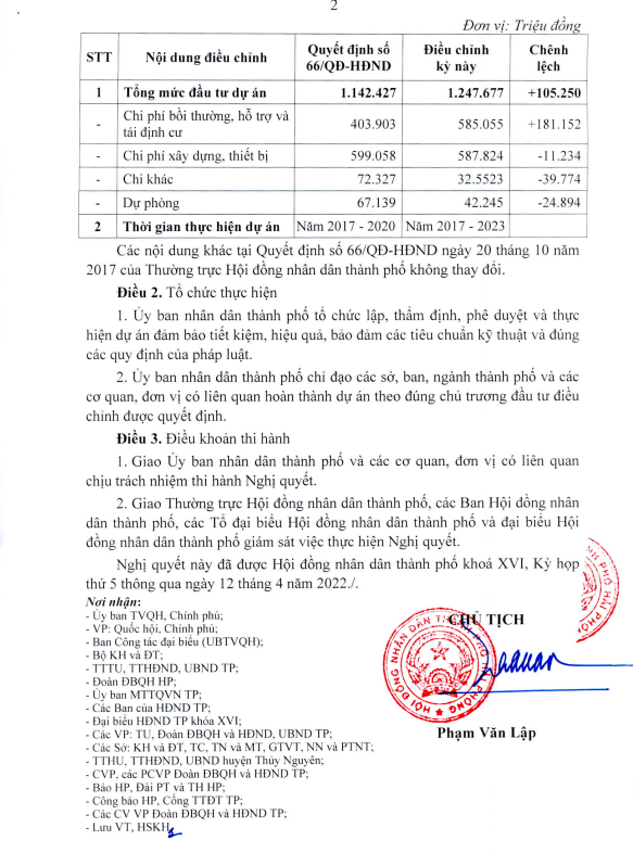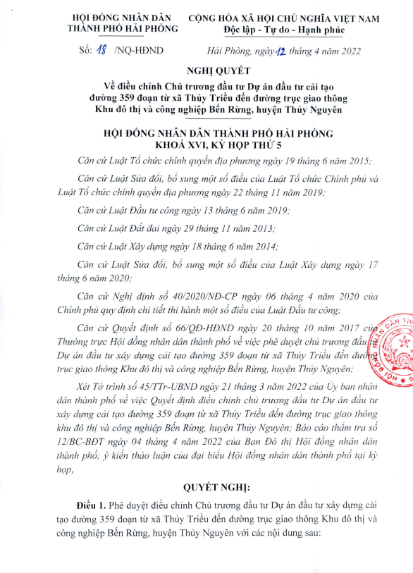 Nghị quyết số: 18/NQ-HĐND ngày 12/4/2022 Về điều chỉnh Chủ trương đầu tư Dự án đầu tư cải tạo đường 359 đoạn từ xã Thủy Triều đến đường trục giao thông Khu đô thị và công nghiệp Bến Rừng, huyện Thủy Nguyên