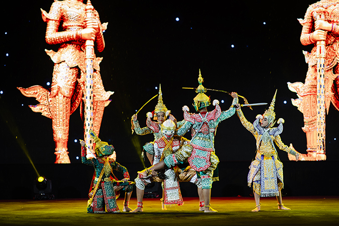 Đoàn Thái Lan mở đầu đêm diễn với tiết mục múa Khòn Ramakien điêu luyện, gây ấn tượng mạnh với người xem.