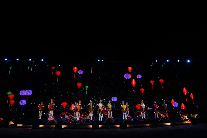 Ngay sau đó, bên cạnh 2 con thuyền khổng lồ, hình ảnh đặc trưng của Vinpearl Nam Hội An, các em nhỏ Trung Quốc đã biến không khí sang sắc thái đầy vui tươi, căng tràn năng lượng. Với phục trang bắt mắt, rực rỡ, kết hợp cùng ánh sáng hiện đại – Kinh kịch truyền thống Trung Quốc được biểu diễn với bộ mặt mới tươi vui, nhộn nhịp hớp hồn người xem.