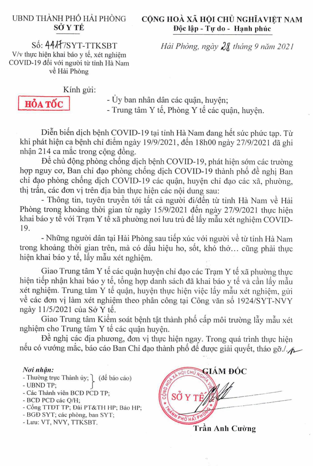 Ngày 28/9, Sở Y tế Hải Phòng ban hành văn bản hỏa tốc số 4417/SYT-TTKSBT về việc thực hiện khai báo y tế, xét nghiệm COVID-19 đối với người từ tỉnh Hà Nam về Hải Phòng.