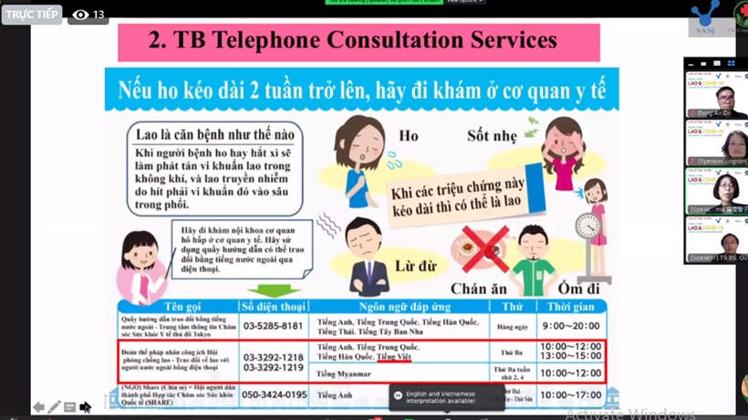 Hội thảo trực tuyến chia sẻ những vấn đề khi tiếp cận với dịch vụ y tế dự phòng của người Việt Nam tại Nhật Bản trong đó có việc phòng chống, điều trị bệnh lao và tiếp cận với vắc xin COVID-19 tại Nhật Bản. Các diễn giả Việt Nam và Nhật Bản là những bác sỹ trực tiếp khám chữa bệnh cho cộng đồng người Việt tại Nhật Bản cũng như đang nghiên cứu về những chính sách hỗ trợ cho người nước ngoài bị lao hoặc COVID-19. Tại diễn đàn này, các diễn giả đã giải đáp thắc mắc liên quan tới chế độ BHYT và khám chữa bệnh lao cũng như tiêm phòng vắc-xin COVID-19 cho người Việt.