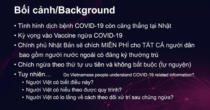 Theo thống kê của Trung tâm Sức khỏe toàn cầu (NCGM) của Nhật Bản, Việt Nam là cộng đồng có số lượng người mắc lao cao nhất trong số những người nước ngoài tại Nhật Bản. Bệnh lao và COVID-19 là những căn bệnh đường hô hấp mà mọi người đều có thể gặp phải. Tuy nhiên, việc tiếp cận với các dịch vụ y tế dự phòng của Nhật Bản để phòng ngừa, phát hiện sớm các căn bệnh trên còn gặp nhiều rào cản như ngôn ngữ, điều kiện tài chính, thông tin.
