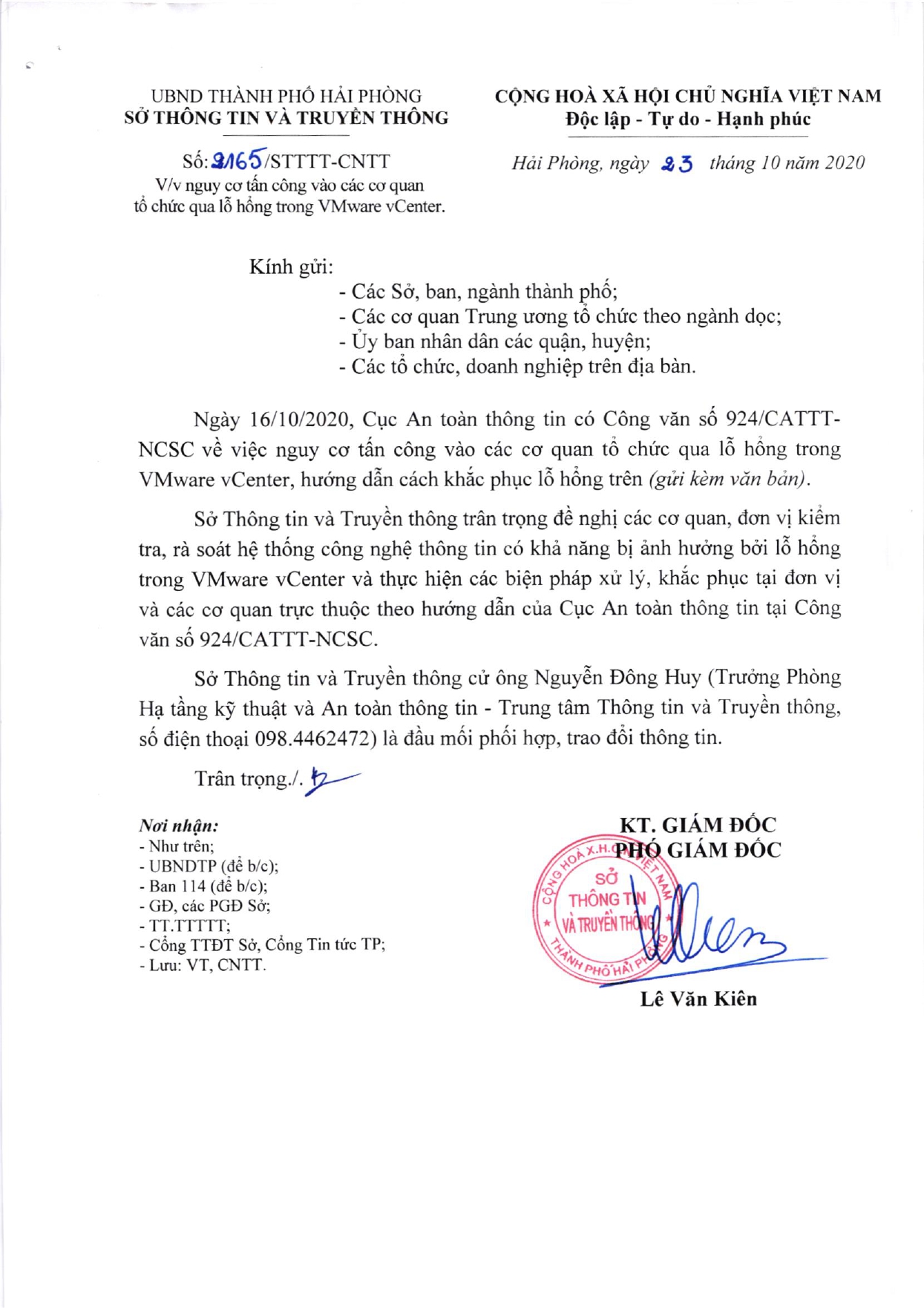 Thực hiện Công văn số 924/CATTT-NCSC ngày 16/10/2020 của Cục An toàn thông tin về việc nguy cơ tấn công vào các cơ quan tổ chức qua lỗ hổng trong VMware vCenter, hướng dẫn cách khắc phục lỗ hổng trên, Sở Thông tin và Truyền thông vừa có văn bản đề nghị các cơ quan, đơn vị thực hiện kiểm tra, rà soát hệ thống công nghệ thông tin có khả năng bị ảnh hưởng bởi lỗ hổng trong VMware vCenter và thực hiện các biện pháp xử lý, khắc phục tại đơn vị và các cơ quan trực thuộc theo hướng dẫn.