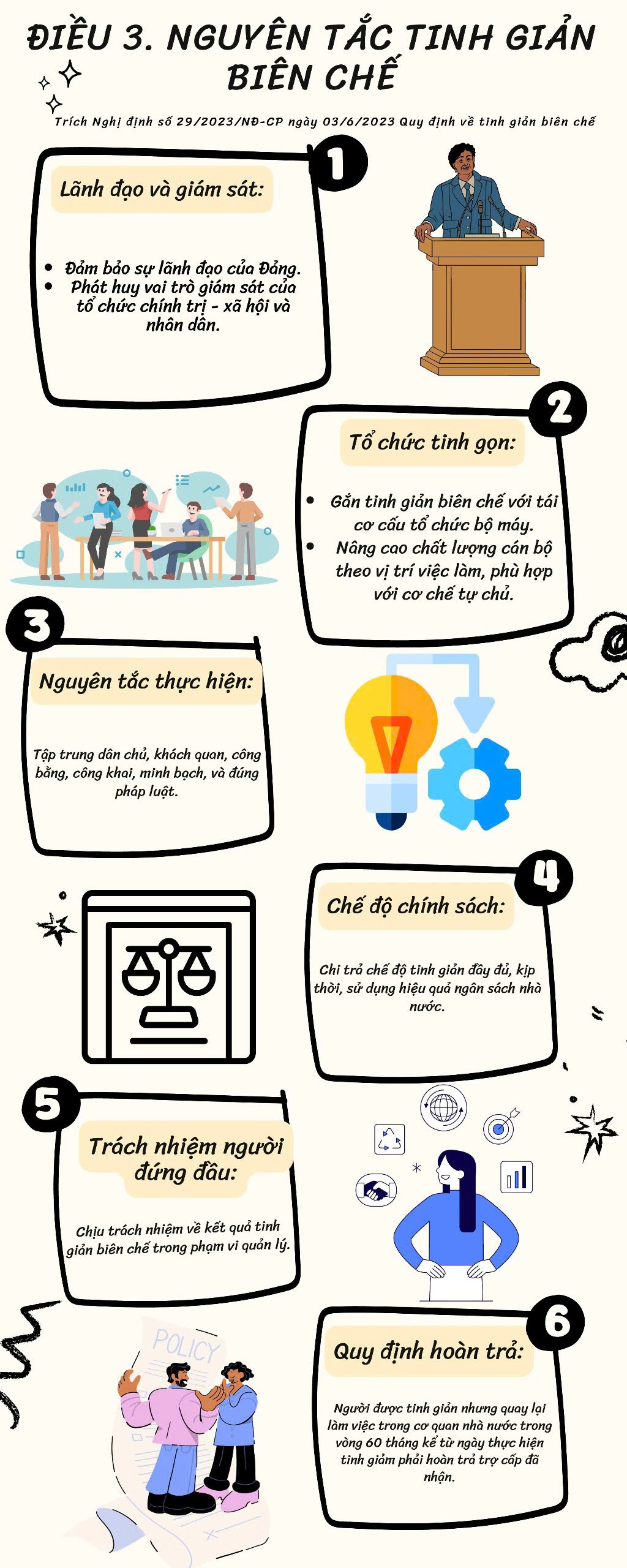 Ngày 03 tháng 6 năm 2023, Chính phủ ban hành Nghị định số 29/2023/NĐ-CP quy định về tinh giản biên chế. Nghị định này gồm 4 chương, 21 điều, quy định về đối tượng, nguyên tắc, chính sách tinh giản biên chế và trách nhiệm thực hiện tinh giản biên chế trong các cơ quan, tổ chức, đơn vị sự nghiệp công lập của Đảng, Nhà nước, tổ chức chính trị – xã hội từ Trung ương đến cấp xã. Trong đó, Điều 3 quy định về Nguyên tắc tinh giản biên chế, cụ thể như sau: