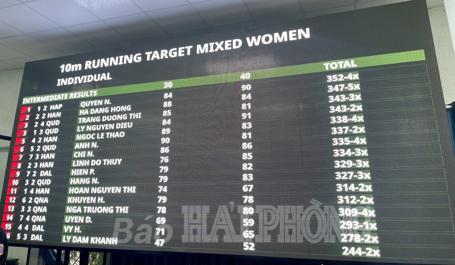 Với thành thích 352 điểm, xạ thủ Nguyễn Thị Lệ Quyên xuất sắc giành vị trí số 1 trên bảng xếp hạng và mang về tấm huy chương vàng quý giá cho thể thao thành tích cao Hải Phòng. Trước đó, bắn súng Hải Phòng giành được 3 huy chương đồng ở các nội dung: 10m súng trường hơi di động tiêu chuẩn cá nhân nam; 10m súng trường hơi di động tiêu chuẩn đồng đội nam; 50m súng ngắn cá nhân nam./.