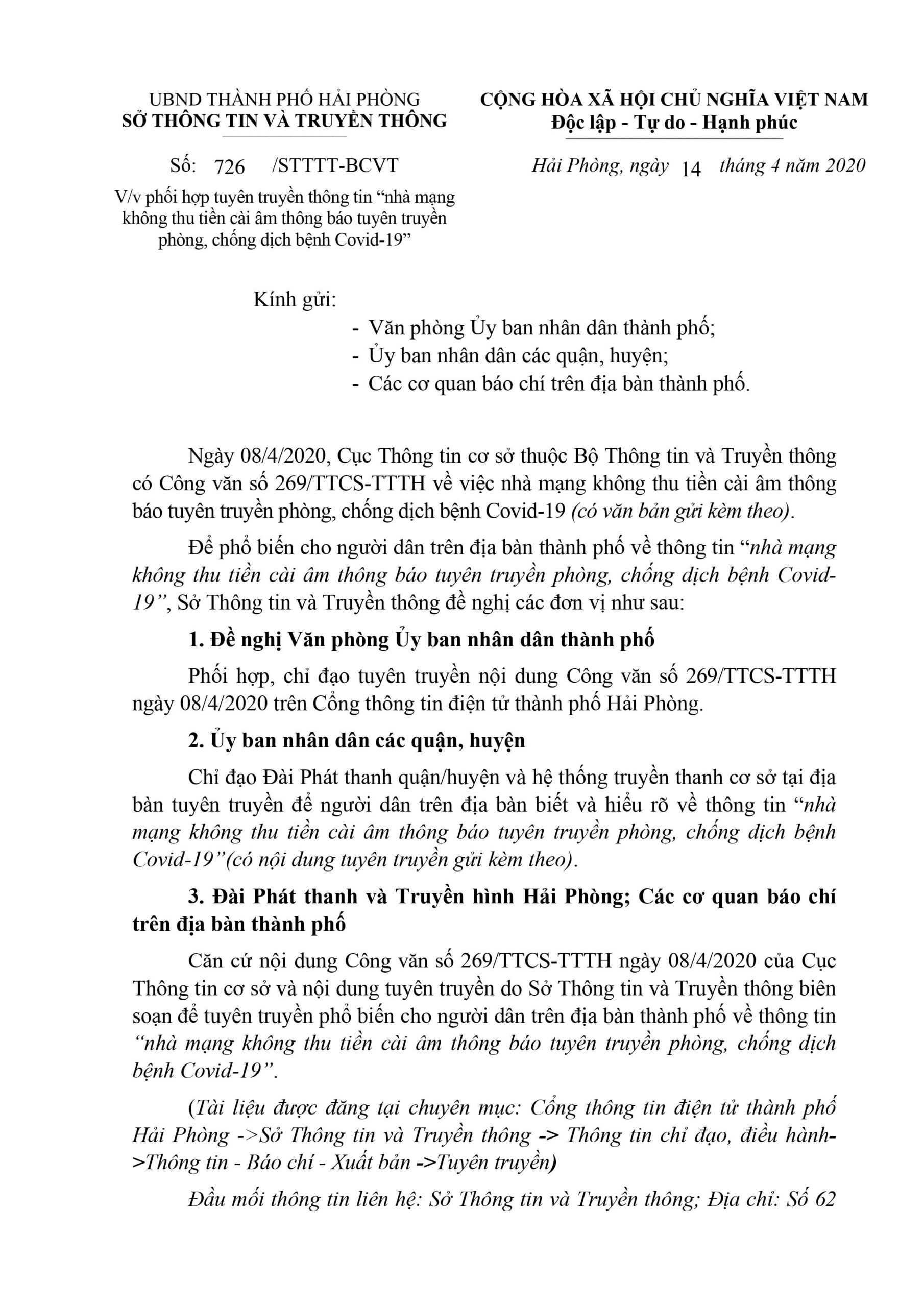 Ngày 14/4/2020, Sở Thông tin và Truyền thông ban hành văn bản số 726/STTTT-BCVT về việc Phối hợp tuyên truyền thông tin “nhà mạng không thu tiền cài âm thông báo tuyên truyền phòng, chống dịch bệnh Covid-19” gửi Văn phòng Ủy ban nhân dân thành phố; Ủy ban nhân dân các quận, huyện; Các cơ quan báo chí trên địa bàn thành phố.