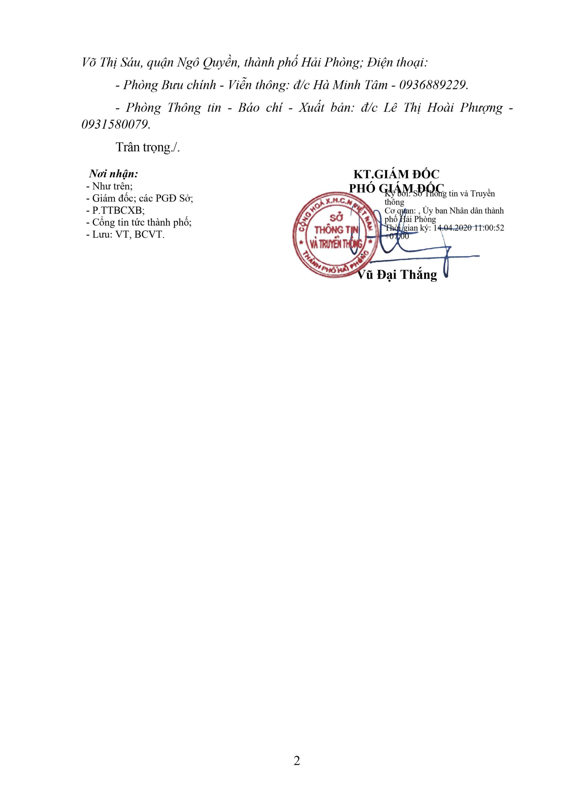 Đầu mối thông tin liên hệ: Sở Thông tin và Truyền thông; Địa chỉ: Số 62 Võ Thị Sáu, quận Ngô Quyền, thành phố Hải Phòng; Điện thoại: