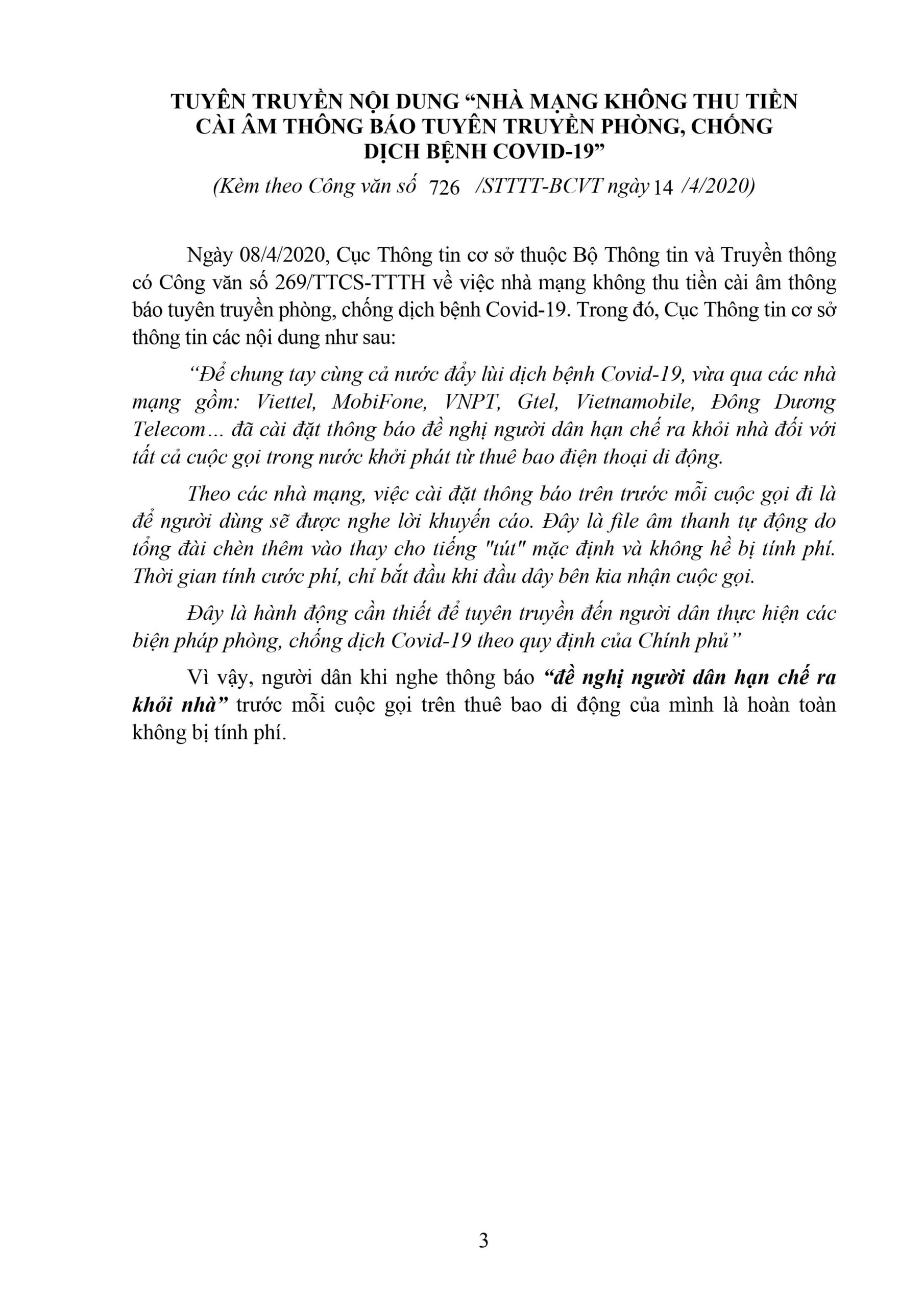 Căn cứ nội dung Công văn số 269/TTCS-TTTH ngày 08/4/2020 của Cục Thông tin cơ sở và nội dung tuyên truyền do Sở Thông tin và Truyền thông biên soạn để tuyên truyền phổ biến cho người dân trên địa bàn thành phố về thông tin “nhà mạng không thu tiền cài âm thông báo tuyên truyền phòng, chống dịch bệnh Covid-19”.