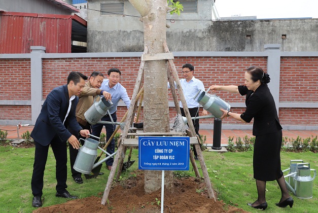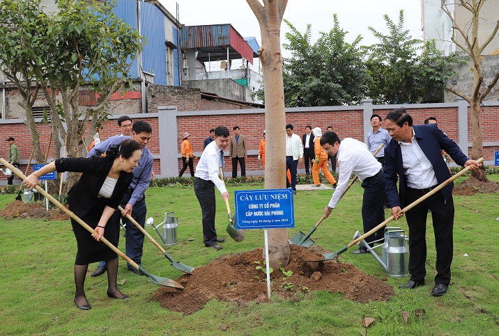 Các đồng chí Lãnh đạo thành phố và doanh nghiệp trồng cây tại khuôn viên Nhà tưởng niệm đồng chí Nguyễn Đức Cảnh