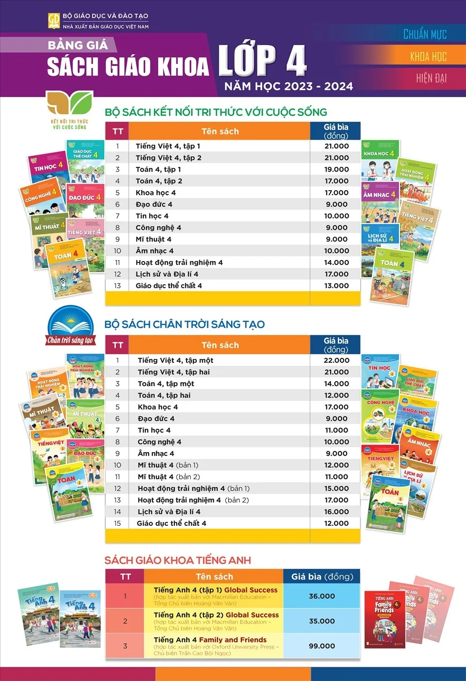 Cụ thể, sách lớp 4 của Nhà xuất bản Giáo dục Việt Nam có giá dao động từ 182.000 đến 186.000 đồng (chưa bao gồm sách tiếng Anh).