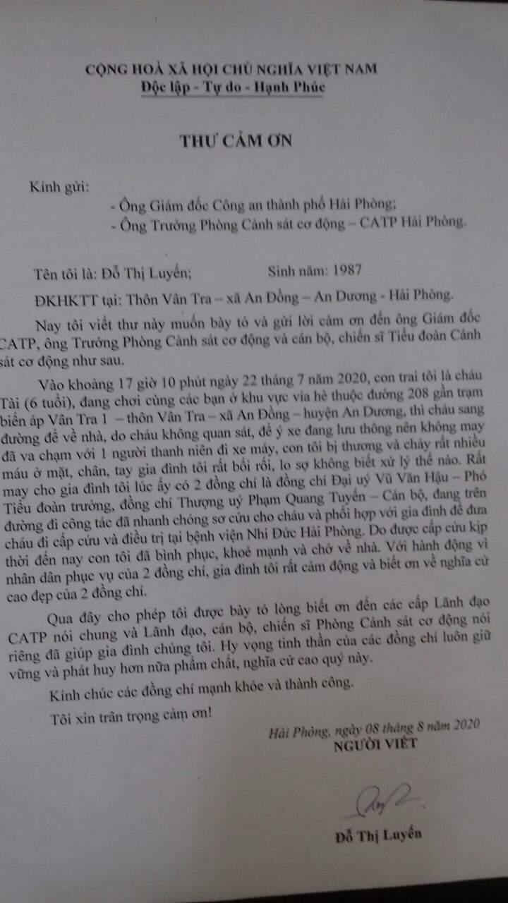 Qua thư, gia đình chị Luyến bày tỏ lòng biến ơn chân thành, sâu sắc đến các cấp lãnh đạo CATP nói chung, lãnh đạo, CBCS Phòng Cảnh sát Cơ động nói riêng, mà cụ thể là Đại úy Hậu và Thượng úy Tuyến đã kịp thời có mặt, cứu giúp cháu Tài qua cơn nguy hiểm…