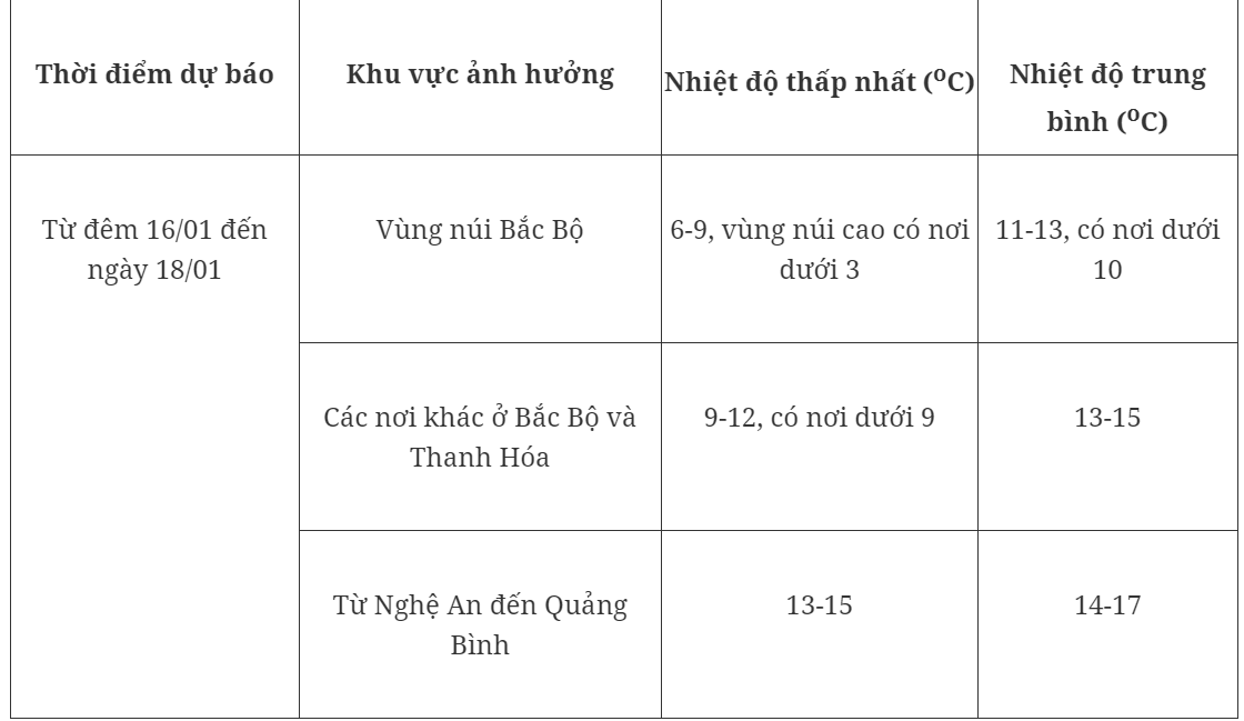Từ chiều tối 16/01 đến khoảng ngày 18/01, ở Bắc Bộ và Bắc Trung Bộ trời rét đậm, vùng núi rét hại; khu vực từ Quảng Bình đến Thừa Thiên Huế trời rét. Trong đợt không khí lạnh này nhiệt độ thấp nhất ở Bắc Bộ phổ biến từ 9-12 độ, khu vực vùng núi Bắc Bộ phổ biến 6-9 độ, vùng núi cao có nơi dưới 3 độ; khu vực Bắc Trung Bộ phổ biến 11-14 độ; khu vực từ Quảng Bình đến Thừa Thiên Huế phổ biến 14-17 độ.
