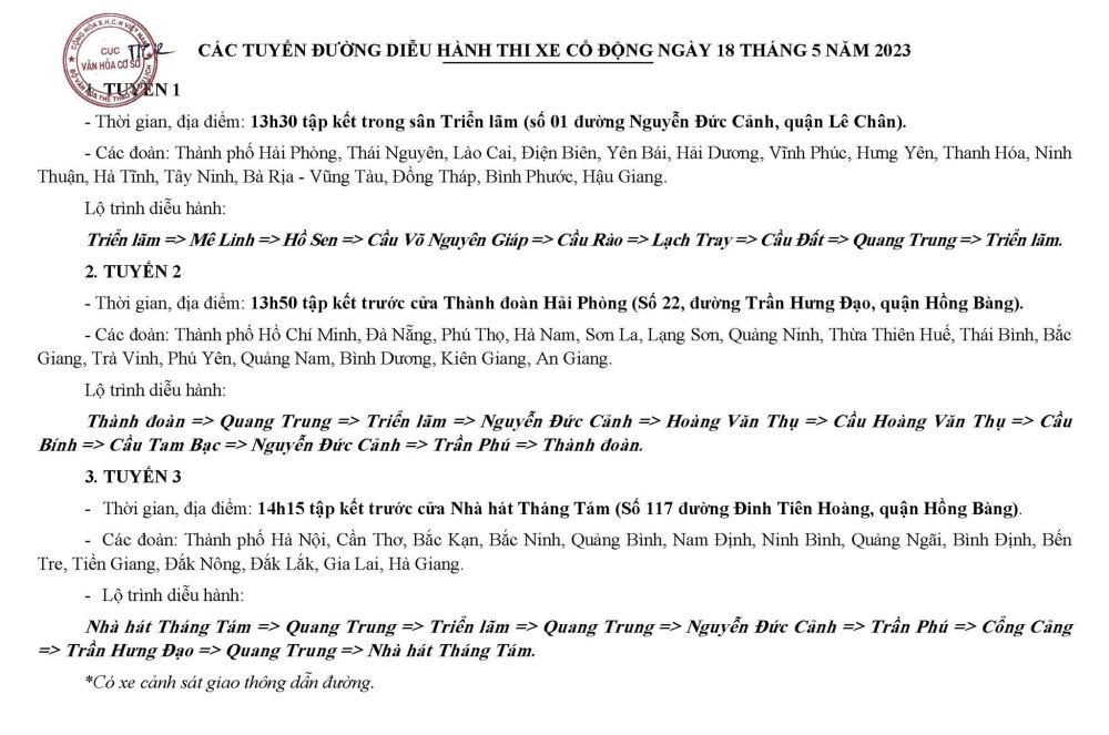 Trong đó, phần thi Diễu hành xe tuyên truyền, các đội sẽ trang trí: Cờ, hoa, pano, áp phích, khẩu hiệu, biển tên đoàn; trang bị loa máy phát thanh đảm bảo gọn nhẹ, an toàn. Chia làm 3 tuyến, diễu hành qua các đường phố của thành phố Hải Phòng. Trong quá trình di chuyển có xe cảnh sát giao thông dẫn đường.