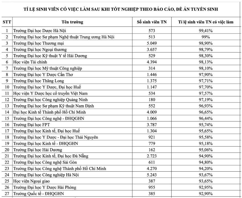 Ngoài ra, một số ngành có tỉ lệ việc làm sau khi ra trường tương đối cao như Quản trị kinh doanh (99,15%), Kinh tế (99,01%), Luật (98,72%)…