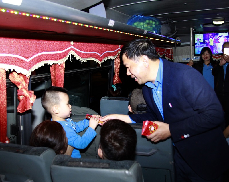Chủ tịch LĐLĐ TP Tống Văn Băng lên từng chuyến xe động viên các gia đình công nhân, lì xì mừng tuổi các cháu nhỏ theo bố mẹ về quê ăn tết.