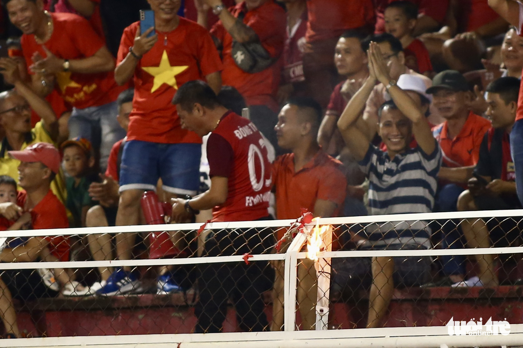 Theo tìm hiểu từ nhân chứng và lực lượng an ninh, một cổ động viên cố gắng tháo dây chùm bong bóng khoảng 30-40 quả. Không thể tháo được dây buộc, cổ động viên này đã dùng hộp quẹt để đốt dây và vô tình bắt lửa khiến chùm bong bóng nổ to.