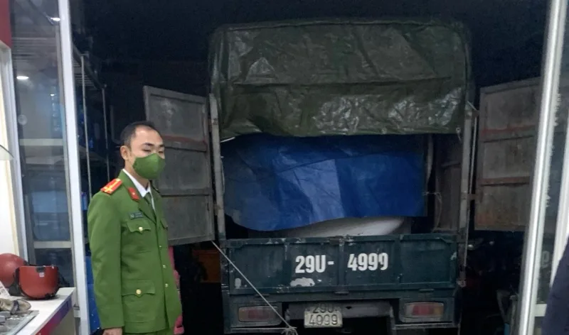 Thời điểm kiểm tra lực lượng chức năng phát hiện 1 xe tải BKS: 29U-4999 chở theo bồn gas có dung tích 4.000m³. Để tránh bị phát hiện cơ sở này không dùng xe bồn mà sử dụng loại xe tải bình thường có mui phủ bạt rồi đặt bồn vào bên trong với đầy đủ dụng cụ sang chiết.