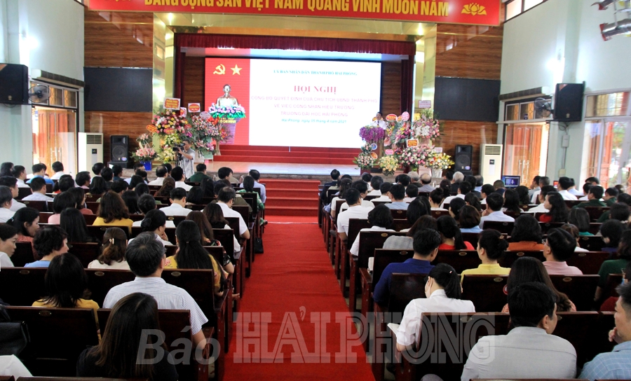 Sáng 5/4, UBND thành phố tổ chức hội nghị công bố quyết định của Chủ tịch UBND thành phố về việc công nhận Hiệu trưởng Trường đại học Hải Phòng. Tới dự có đồng chí Lê Khắc Nam, Phó chủ tịch UBND thành phố; đại diện lãnh đạo các sở, ngành; lãnh đạo quận Kiến An; các đồng chí nguyên lãnh đạo Trường đại học Hải Phòng và toàn thể cán bộ, viên chức, người lao động toàn trường.