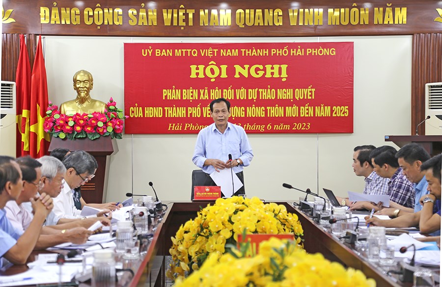 Phát biểu tại Hội nghị, đồng chí Đỗ Tràng Thành, Phó Chủ tịch Ủy ban MTTQ Việt Nam thành phố hoan nghênh các đại biểu đã tích cực đóng góp ý kiến phản biện sâu sắc cụ thể đối với dự thảo Nghị quyết của HĐND thành phố về xây dựng NTM đến năm 2025 tại thành phố Hải Phòng. Nội dung góp ý tập trung tính khả thi, thực tiễn; đảm bảo điều kiện triển khai Nghị quyết hiệu quả; trách nhiệm của các ngành liên quan, cơ chế vận hành. Đồng chí nhấn mạnh: Đề án đã đề ra các mục tiêu chung, 4 nhóm mục tiêu cụ thể; khoanh định rõ phạm vi và đối tượng của Chương trình. Từ đó đề xuất 11 nhóm nội dung triển khai của Chương trình; xác định các nguyên tắc, tiêu chí, định mức phân bổ ngân sách nhà nước cho Chương trình và cơ chế thực hiện. Bên cạnh đó, Đề án cũng đề xuất 2 nhóm chính sách đặc thù (cơ bản vẫn duy trì các nhóm chính sách đã thực hiện giai đoạn trước). Đề án cũng đã tính toán nguồn lực huy động cho Chương trình và đề xuất 6 nhóm giải pháp thực hiện Chương trình; phân công các tổ chức, cơ quan trong hệ thống chính trị tổ chức triển khai thực hiện. Về cơ bản, phần lớn các nội dung của Đề án đáp ứng các điều kiện để trình HĐND xem xét, ban hành Nghị quyết.
