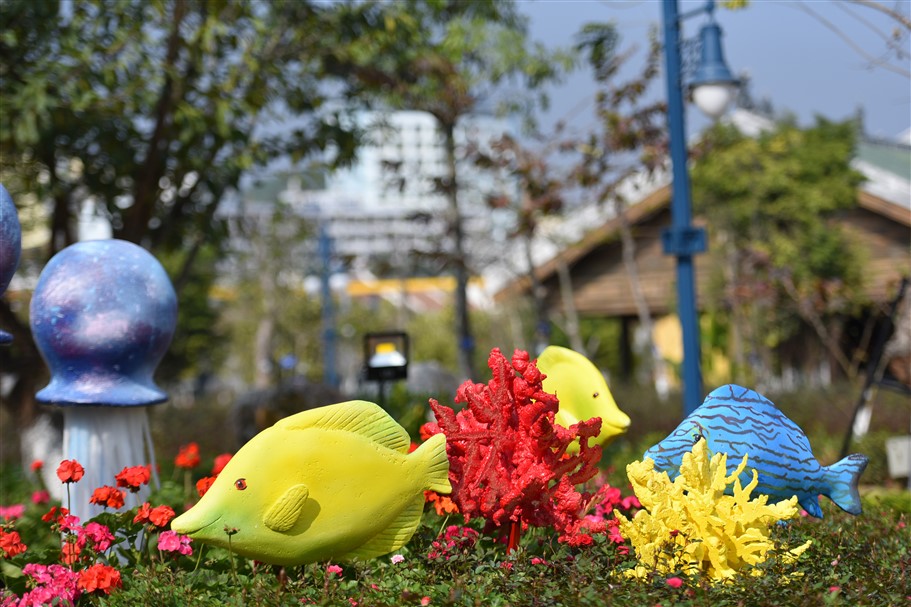 Hòn Trống Mái – biểu tượng của Hạ Long đã được tái hiện theo phong cách hoàn toàn mới mẻ. Đa sắc màu và cực kỳ trẻ trung, Hòn Trống Mái nổi bật trên một thảm hoa trạng nguyên đỏ thắm.