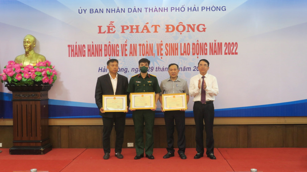 Ghi nhận những nỗ lực trong thời gian qua, Chủ tịch UBND thành phố đã ký Quyết định tặng Bằng khen cho 3 tập thể có thành tích xuất sắc trong công tác an toàn, vệ sinh lao động năm 2021, gồm: Phòng Kỹ thuật-Bộ Chỉ huy Quân sự thành phố, Công ty TNHH Thuốc lá Hải Phòng và Công ty TNHH Đóng Tàu Damen-Sông Cấm.