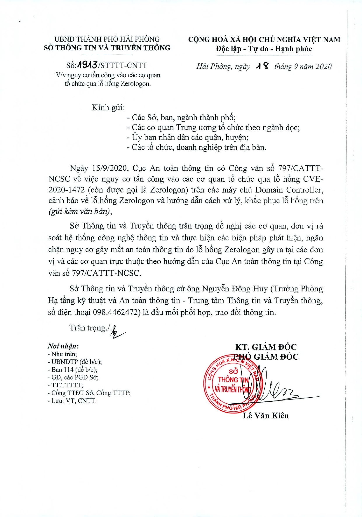 Thực hiện Công văn số 797/CATTT-NCSC, ngày 15/9/2020 của Cục An toàn thông tin về việc nguy cơ tấn công vào các cơ quan tổ chức qua lỗ hổng CVE-2020-1472 (còn được gọi là Zerologon) trên các máy chủ Domain Controller, cảnh báo về lỗ hổng Zerologon và hướng dẫn cách xử lý, khắc phục lỗ hổng trên;